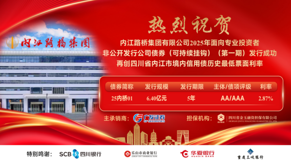 為進(jìn)一步優(yōu)化融資結(jié)構(gòu),降低融資成本,內(nèi)江路橋集團(tuán)認(rèn)真貫徹落實市委市政府關(guān)于降低資金成本、化解債務(wù)風(fēng)險有關(guān)安排部署要求,通過前期充分準(zhǔn)備、擇優(yōu)選擇券商,于2025年3月25日成功發(fā)行一筆公司債券,規(guī)模6.4億元,期限5年,票面利率2.87%,為當(dāng)期全國同類型主體5年期債券發(fā)行最低利率,再創(chuàng)我市境內(nèi)信用債票面利率歷史新低。